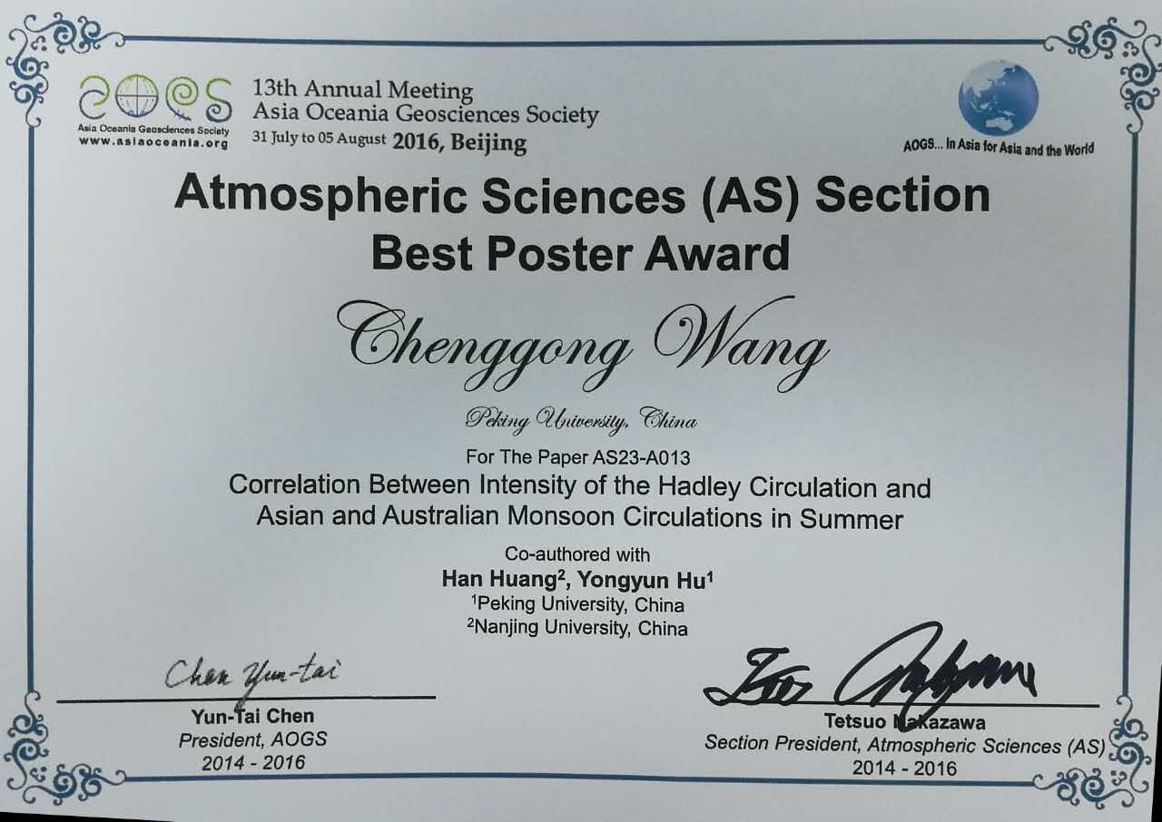 在2016年8月1-5日召开的第十三届“亚洲大洋洲地球科学学会”(Asia Oceania Geosciences Society, AOGS)大会上,必一·运动(B-Sports)官方网站2012级本科生王成功获大气科学领域“最佳学生海报奖”(Best Student Poster Award)。该奖项从所有大气科学领域学生海报中选出,评选标准是海报内容的科学性、创新性、海报设计、以及展示者回答问题的表现等。