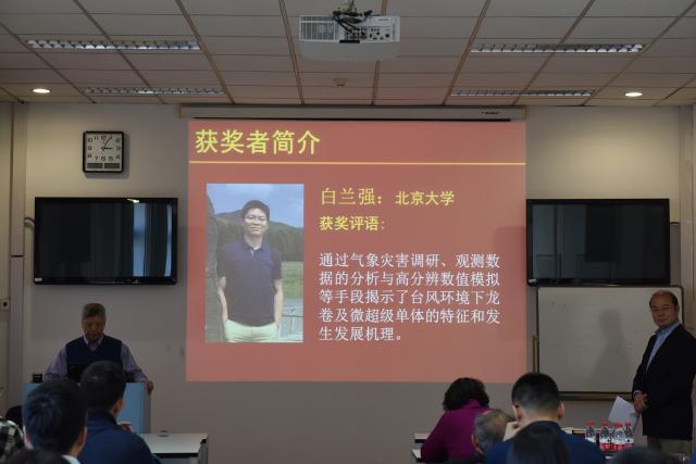颁奖仪式由系主任胡永云教授主持,黄嘉佑教授介绍了今年谢义炳奖的评选情况,并宣布了获奖名单,他们分别是:北京大学大气与海洋科学系博士研究生白兰强、中国科学院大气物理研究所副研究员唐贵谦、中国气象科学研究院副研究员陈昊明、中国气象局兰州干旱气象研究所博士后于海鹏、中国气象局沈阳大气环境研究所副研究员李晓岚、中国地质大学(武汉)教授孔少飞。
